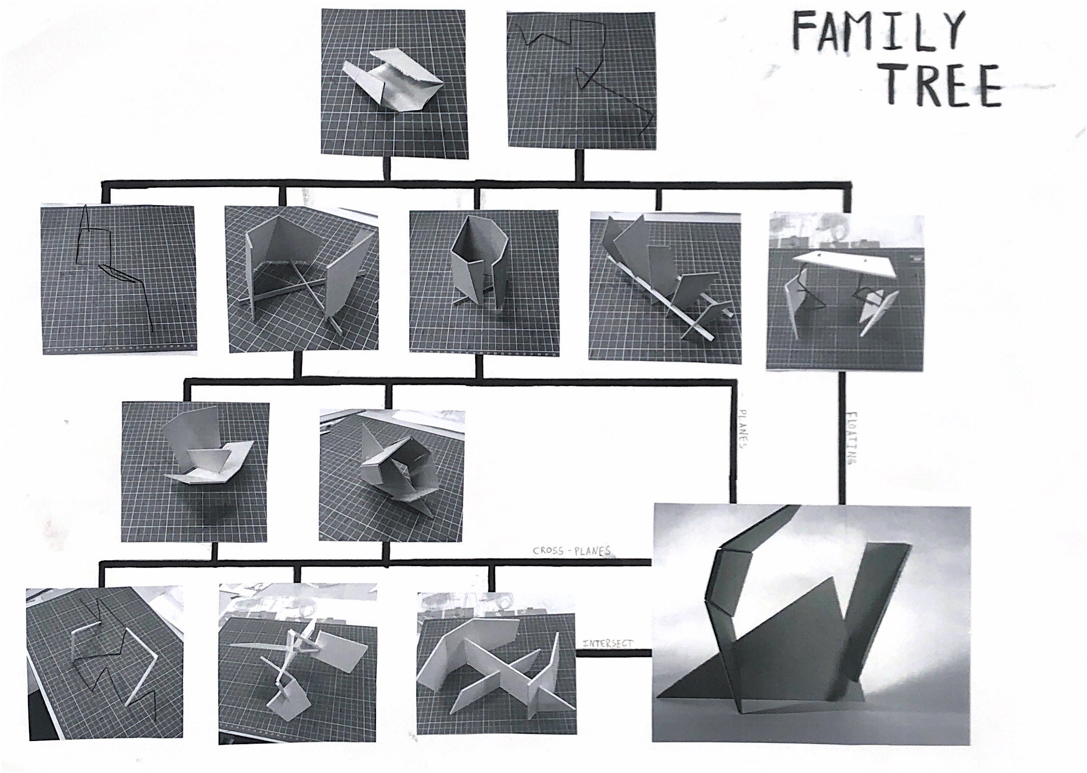 The direction & angle of these planes make the sequence of models analyzed in drawing & old school 3D cardboard modelling.