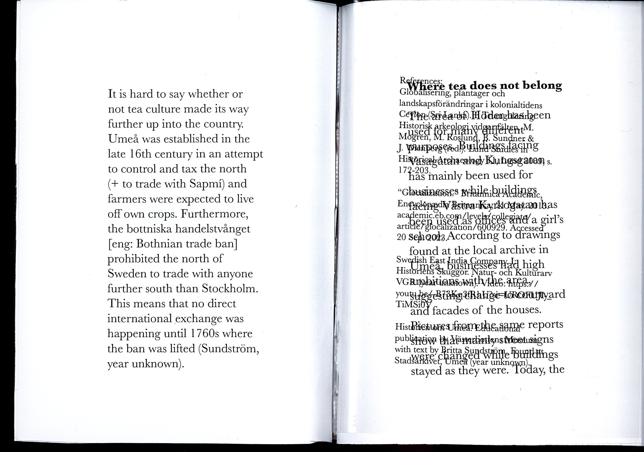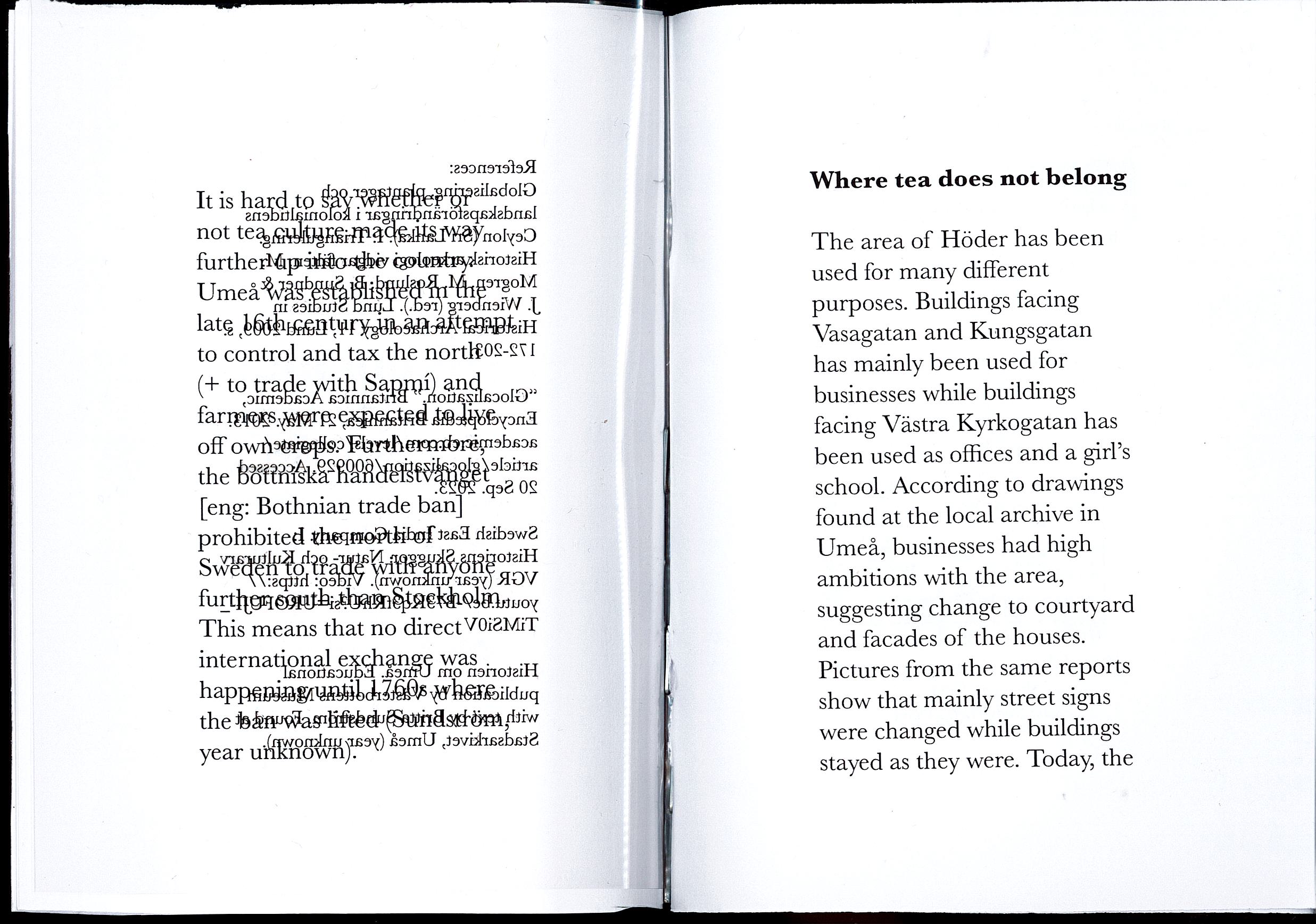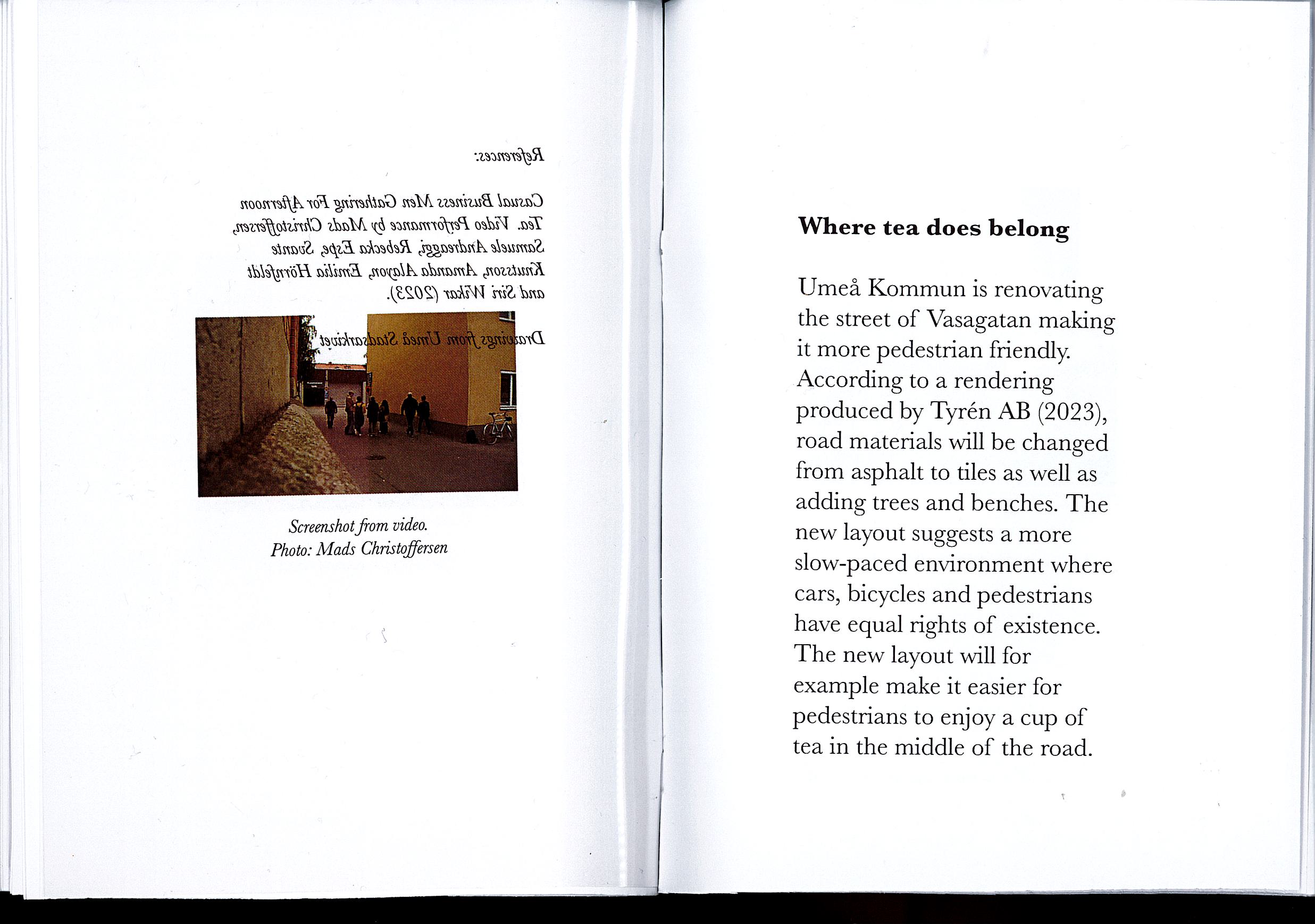 Tea culture in Northern Sweden was never a thing. Most tea was imported into Sweden after establishment of Swedish East Indian Company (SOIC) in 1733, but the golden spices did not make its way further up north. Bottniska Handelstvånget [Bothnic Trade Ban] restricted the northern most parts of Sweden to trade goods with anyone abroad or south of Stockholm, so it is unclear how delayed tea culture's arrival was. In an effort to introduce ‘high tea culture’ in the north of Sweden, we decided to invite the citizens of Umeå for a proper afternoon tea. The gathering took place at noon in the middle of a busy street, forcing us to constantly adapt to the cars, bicyclists and pedestrians.